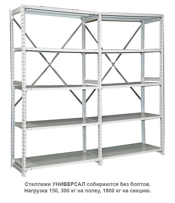 Металлические, усиленные, перфорированные полки стеллажа отличаются высокой надёжностью. Максимум распределённой нагрузки на одну полку – до 300 кг, на весь стеллаж – до 1800 кг.