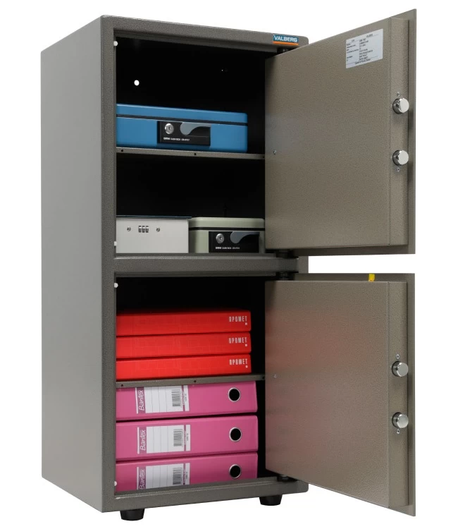 Сейф ASM-90/2 состоит из двух секций, каждая из которых запирается надёжным ригельным механизмом из двух горизонтальных ригелей (выдвигающихся стержней из прочного металла), который приводится в действие качественным ключевым замком KABA MAUER немецкого производства.